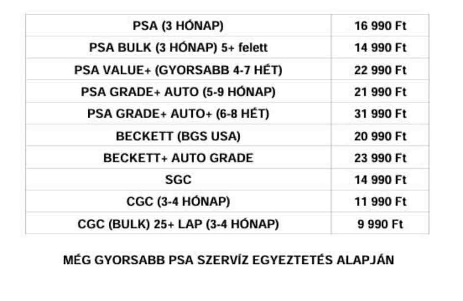 - Beckett Grading Services (BGS) — különösen népszerű a modern és autogramos kártyáknál; belső részpontozást is ad (pl. centering, corners stb.).